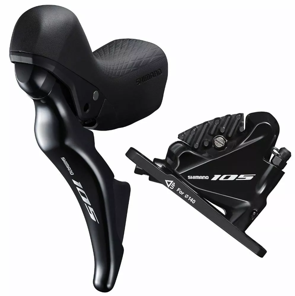 La mayor innovación del grupo 105 es, sin duda, la introducción de un sistema de frenos de disco hidráulicos integrados en el grupo. Las nuevas pinzas BR-R7070 de montaje plano son compatibles con las pastillas de freno ICE TECHNOLOGIES, así como con los discos de freno SM-RT70 que cumplen la normativa UCI (sin ángulo de 90 grados), proporcionando un alto nivel de disipación del calor. La contrapartida en el manillar son las nuevas palancas ergonómicas de doble mando de cambio/freno (ST-R7020), que, al igual que las palancas ULTEGRA ST-R8020, ofrecen un mayor rango de ajuste para diferentes tamaños de mano o anchuras de empuñadura. Para aún más opciones de individualización, el grupo 105 R7000 ofrece un modelo adicional STI (ST-R7025), que ha sido especialmente diseñado para ciclistas con manos pequeñas cambiando el ángulo hacia el manillar y hacia fuera