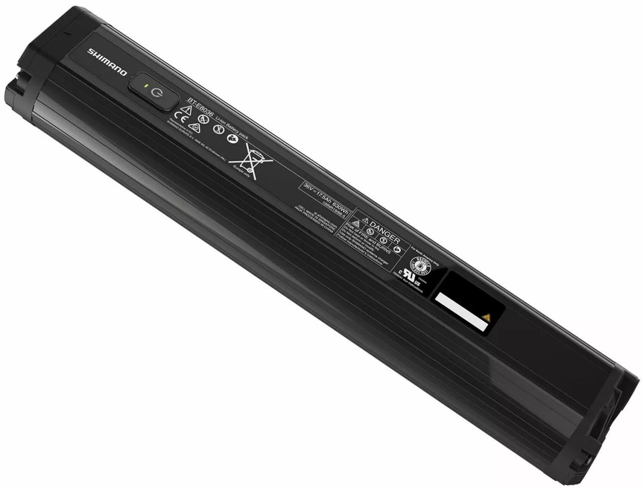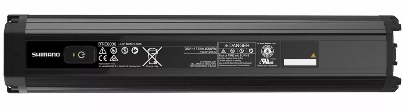 La batería Shimano Steps BT-E8036, extremadamente compacta, duradera y resistente al agua (integrada y que permite un diseño delgado del cuadro), cuenta con un diseño de bajo perfil desarrollado específicamente para las E-MTB para una mayor resistencia a los golpes y las vibraciones. La batería de alto rendimiento, con una excelente autonomía y 630 Wh, ofrece una recarga constante y es compatible con la serie SHIMANO E8000 E-MTB.