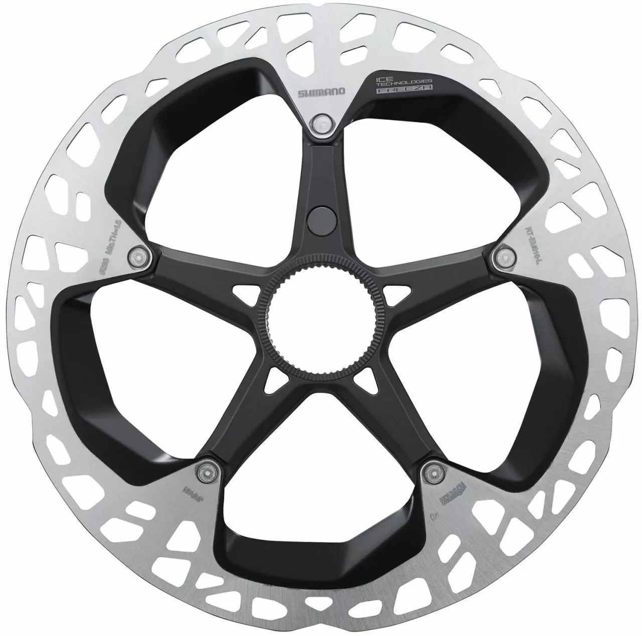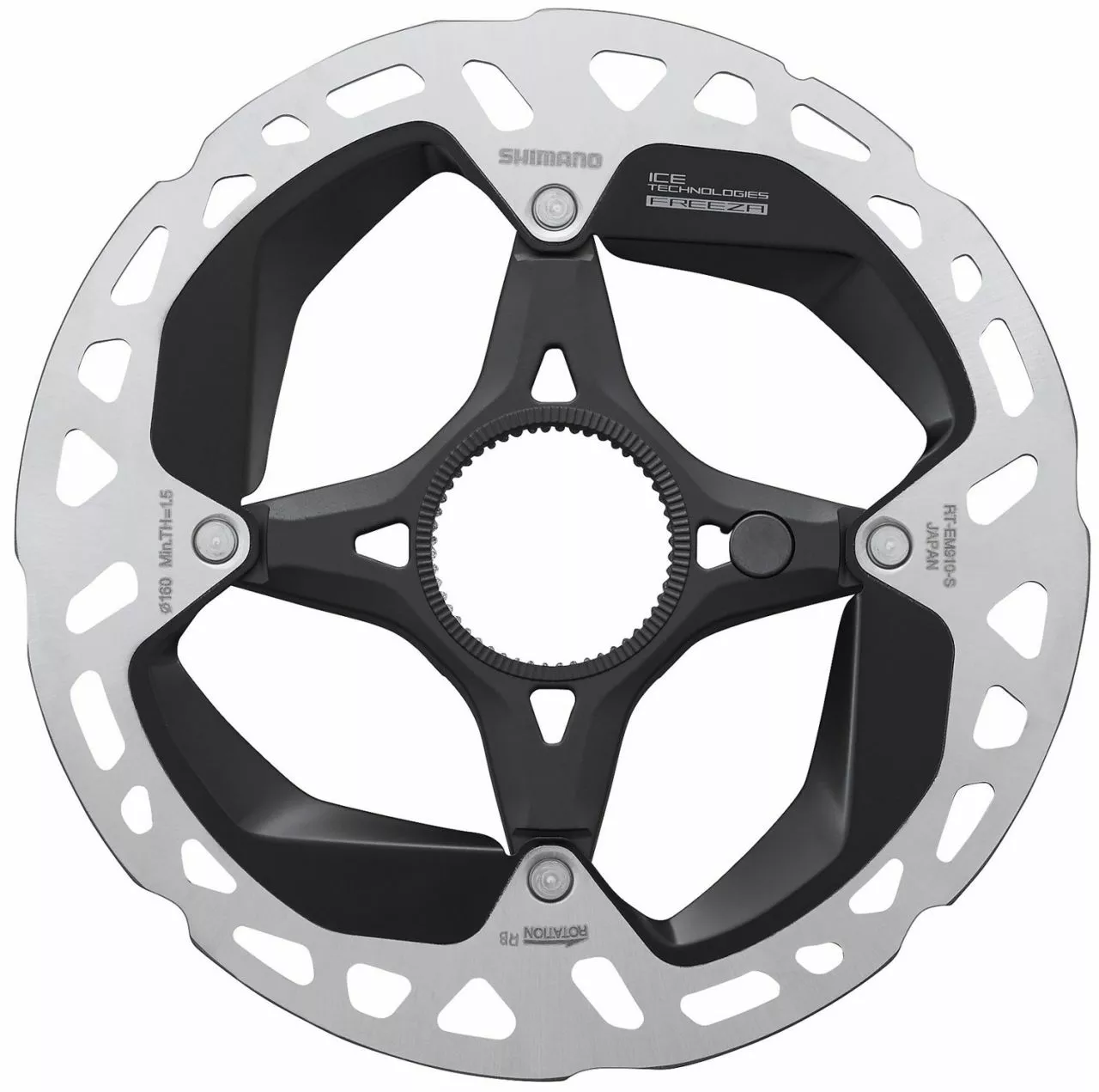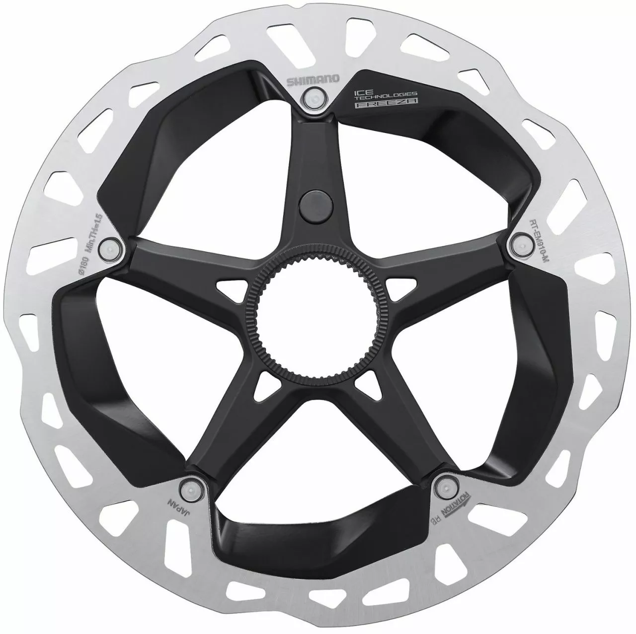 El disco de freno Steps RT-EM910 e-bike de Shimano con montaje de bloqueo central, tecnología ICE-TECH FREEZA e imanes integrados.